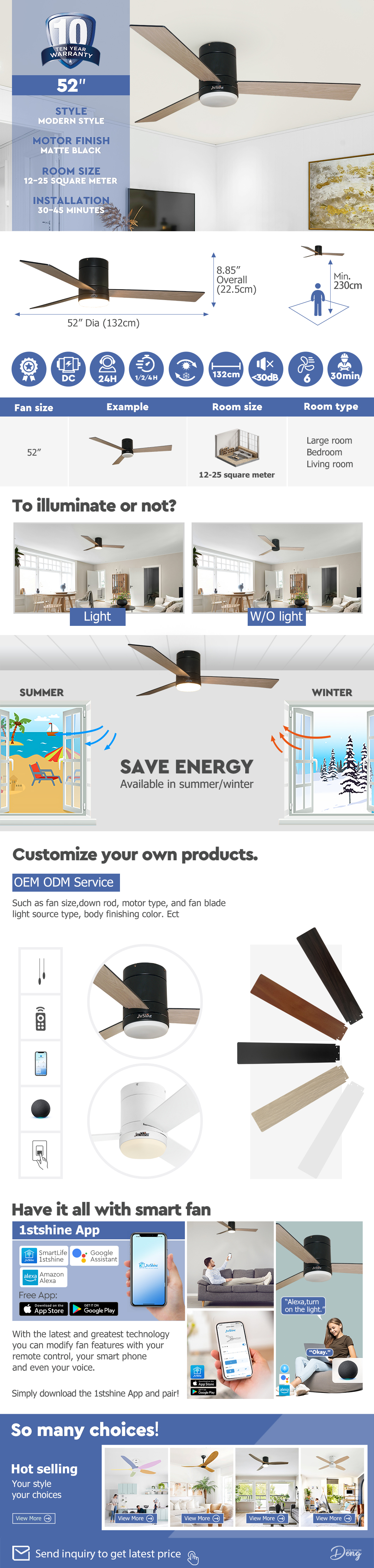 52 inch flush mount ceiling fan 3 plywood blades silent dc motor